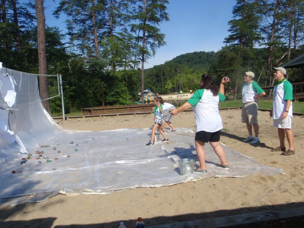 One of the most popular grief activities during the weekend is ‘Big Emotions.’ Each camper expresses their current feelings and emotions on mural paper; some use words, some draw pictures and some use symbols that they feel emotion to. The paper is taped to a wall and family members throw hard balls of clay at the picture tearing it to pieces. While throwing the balls of clay, they are encouraged to scream and holler as loud as they would like to express their grief. Afterwards they reflect on safe, allowable ways strong emotions can be expressed and supported within their families.