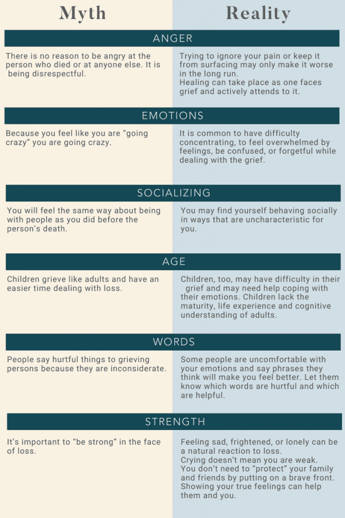 The truth is, there are many ways people can choose to handle their grief or address it. The following table describes typical myths that are associated with grieving, as well as the reality that may occur during grief.