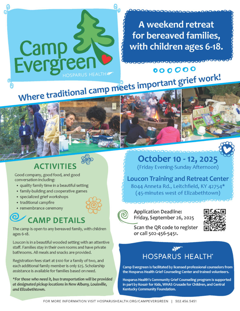 This fall, Hosparus Health proudly hosts the 30th annual Camp Evergreen, a weekend retreat designed for families with children ages 6–18 who have experienced the death of someone close to them. The 2025 camp will take place October 10–12 at Loucon Training and Retreat Center in Leitchfield, KY, just 45 minutes west of Elizabethtown.