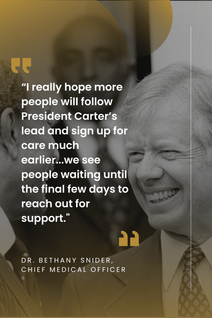 “I really hope more people will follow President Carter’s lead and sign up for care much earlier. Although the hospice benefit is covered by insurance, Medicaid, or Medicare for six months of services with normal disease progression, far too often, we see people waiting until the final few days to reach out for support,” said Dr. Snider. “The true beauty of our mission-driven work is when we are able to help manage symptoms and medications, while also addressing the psychosocial and spiritual needs of the patients and families we support. According to several studies, patients receiving the full hospice benefit report experiencing a better quality of life during the end-of-life stage and would recommend these services to others. Hospice care provides hope by offering patients freedom from the fears of isolation, abandonment, loneliness, loss of control, and physical pain; and hope that their family will be nurtured and supported.”