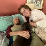 trying to pet Buffy and they had an idea. They knew how much it would mean for him to be able to have her close by, so they asked if he wanted Buffy beside him. He agreed and they creatively rearranged the furniture to help get the heavy dog onto the bed.