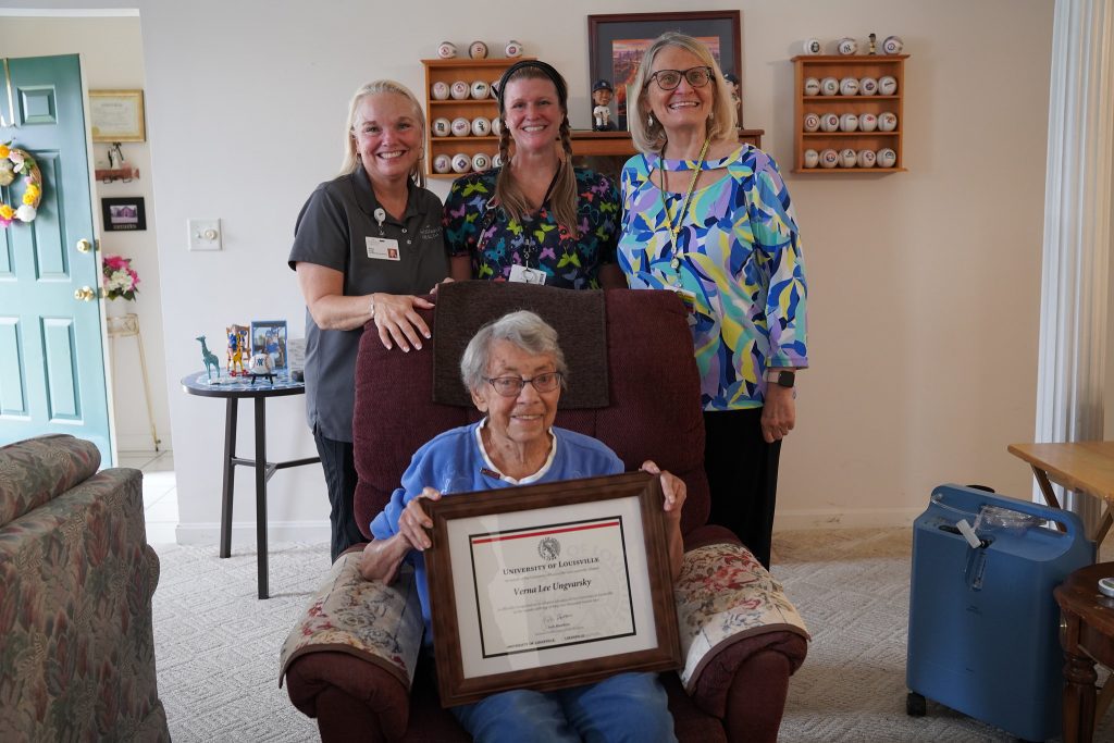 Verna’s family and Hosparus team had arranged a celebration, where she marveled at the outpouring of love, compassion, and UofL-themed gifts: “I never dreamed I’d ever, ever have a diploma or be a member of the alumni of The Kent School. And you folks have made that happen. And I thank you from the bottom of my heart. God bless each of you.”
