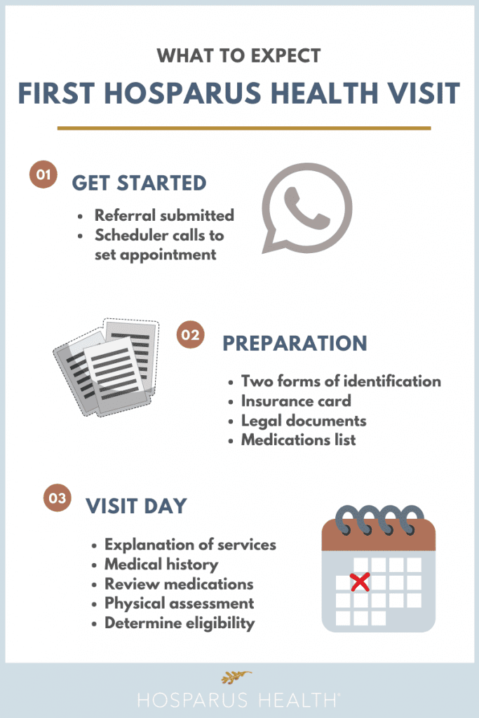 Our admission nurse’s last job is to let the patient and family know their care team members will be in touch to set up regular visits, and to call us anytime, day or night, with questions or concerns. The first visit is often the longest, lasting up to three hours. But our admissions nurse is there to guide you along the way and answer any questions.