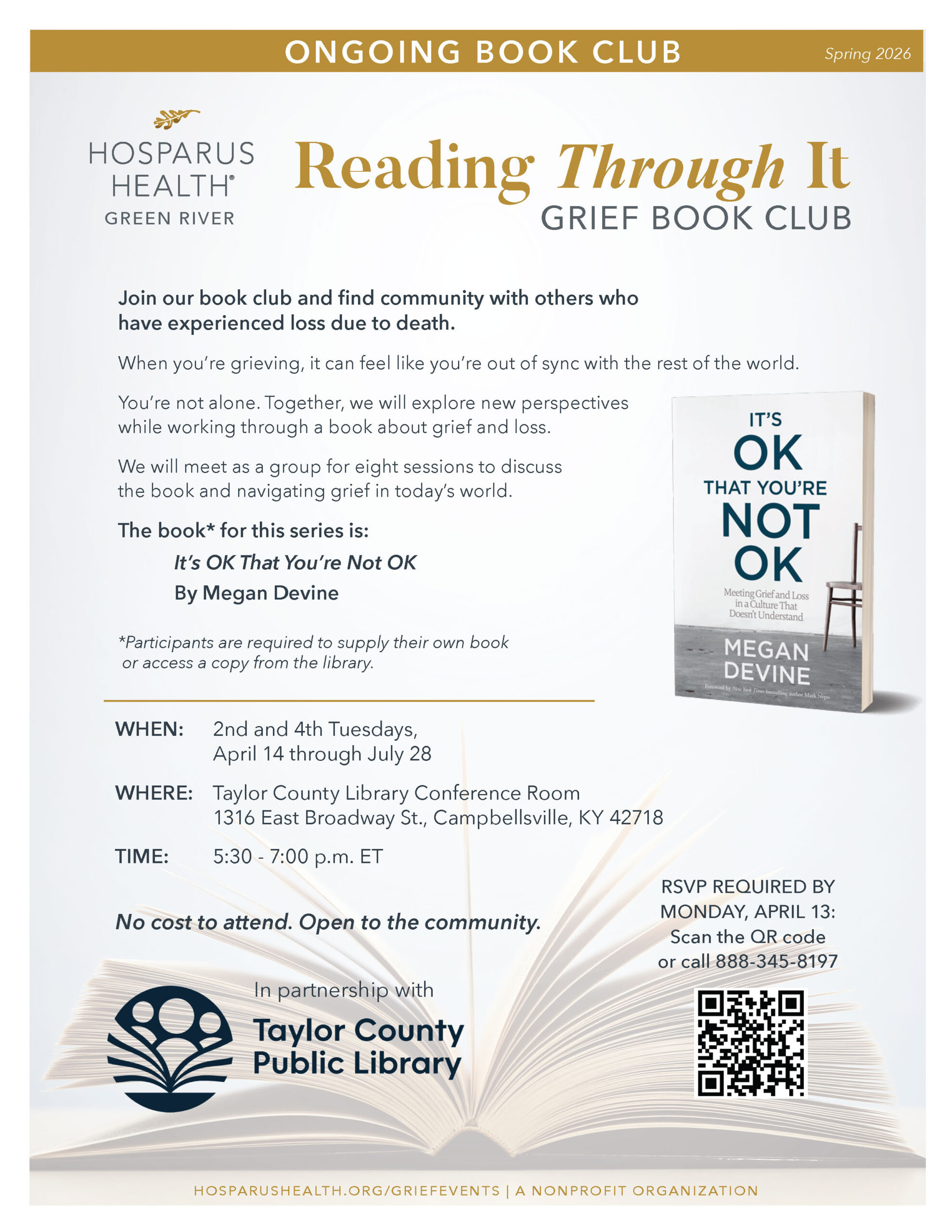 When you’re grieving, it can feel like you’re out of sync with the rest of the world. You’re not alone. Together, we will explore new perspectives while working through a book about grief and loss. We will meet as a group for eight sessions to discuss the book and navigating grief in today’s world.